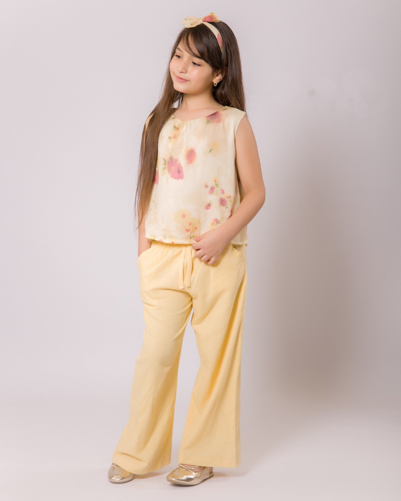 Un ensemble fluide et ensoleillé qui respire la douceur estivale ! Le haut sans manches à imprimé floral aquarelle s’associe parfaitement avec un pantalon large jaune pâle.