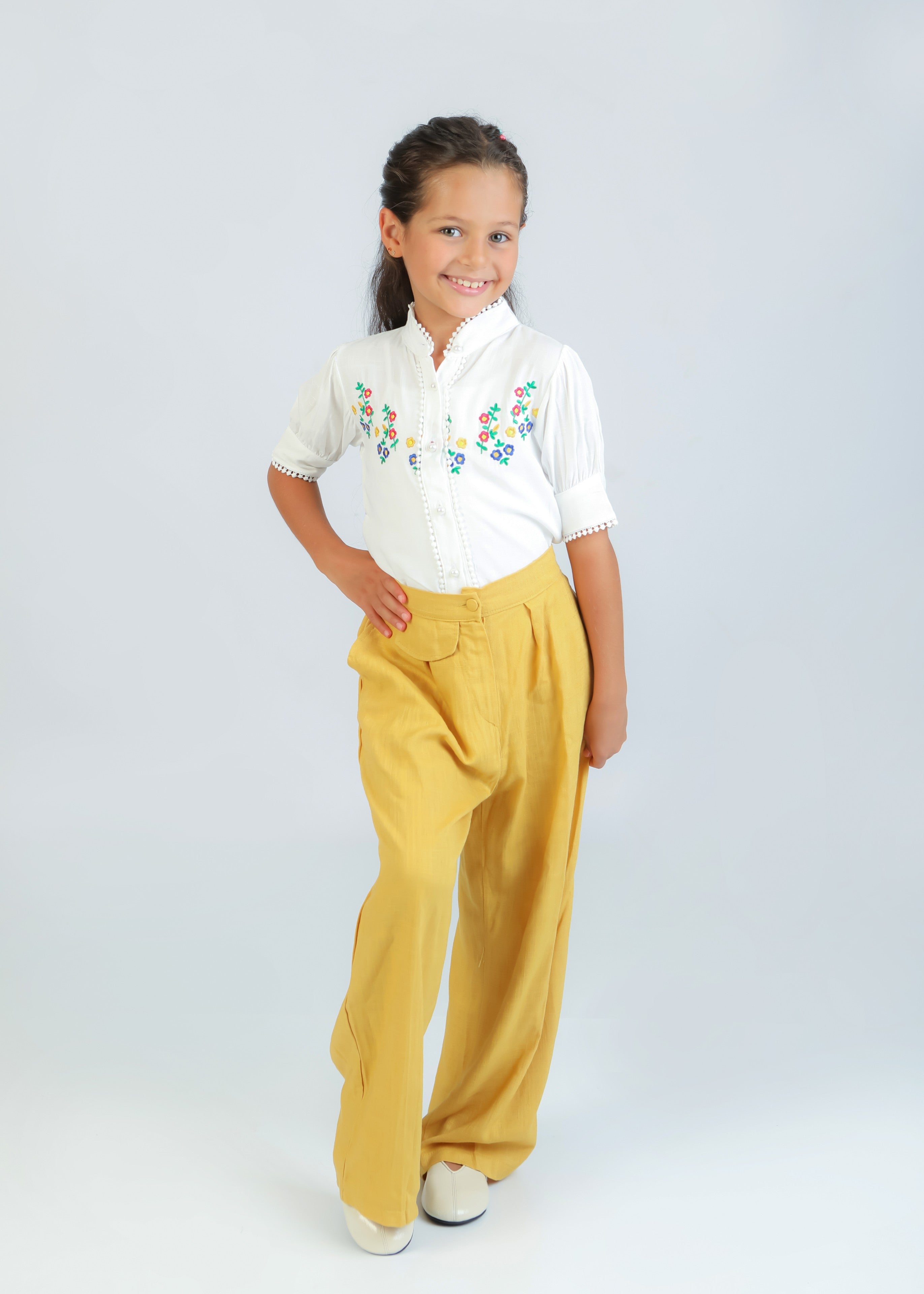Un duo plein de charme. La chemise blanche brodée de petites fleurs colorées se marie parfaitement avec le pantalon large jaune moutarde pour une allure stylée et confortable à la fois. Parfait pour les journées printanières ou les sorties élégantes.