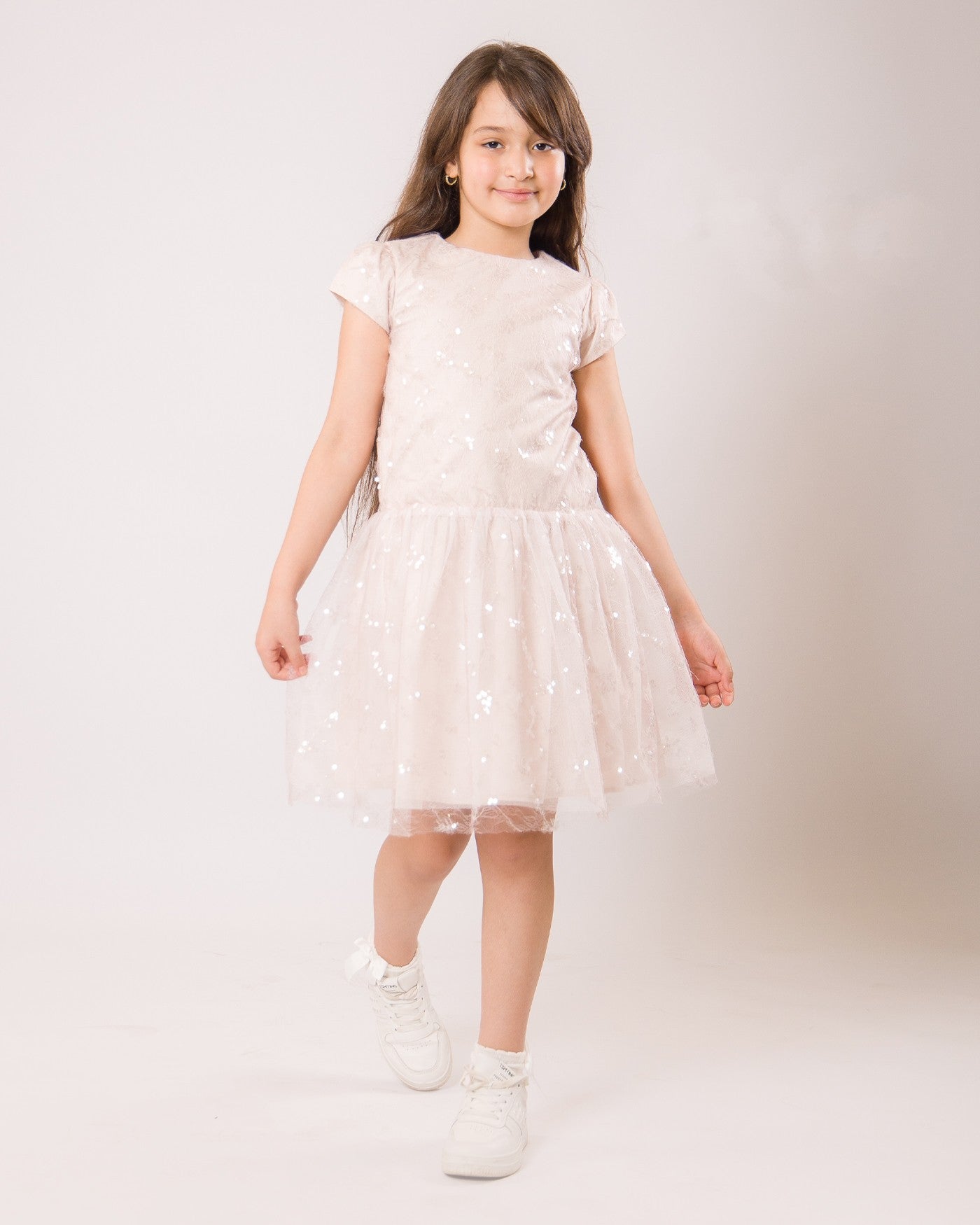 Une robe délicatement scintillante qui illumine chaque mouvement ! Confectionnée dans un tissu rose pâle avec une superposition de tulle à sequins, cette robe est parfaite pour les fêtes, anniversaires ou toute occasion spéciale.