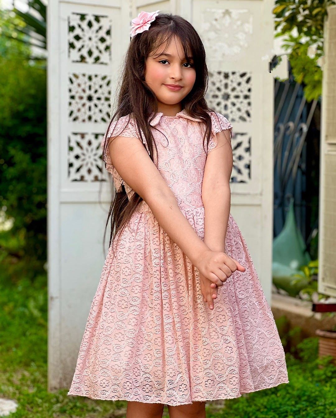 Un véritable coup de cœur ! Cette robe rose poudré en dentelle florale est parfaite pour les occasions spéciales. Sa coupe princesse, son col Claudine raffiné et ses manches volantées lui donnent une allure douce et gracieuse.