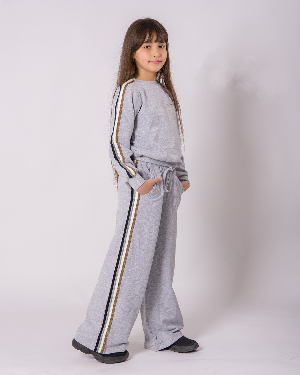 Un look sporty-chic irrésistible pour les jeunes filles modernes ! Cet ensemble confortable en coton mélangé se compose d’un sweat-shirt gris à manches longues avec bandes contrastantes dorée, noire et blanche sur les bras, assorti à un pantalon large à taille élastique et cordon de serrage. Un style décontracté parfait...